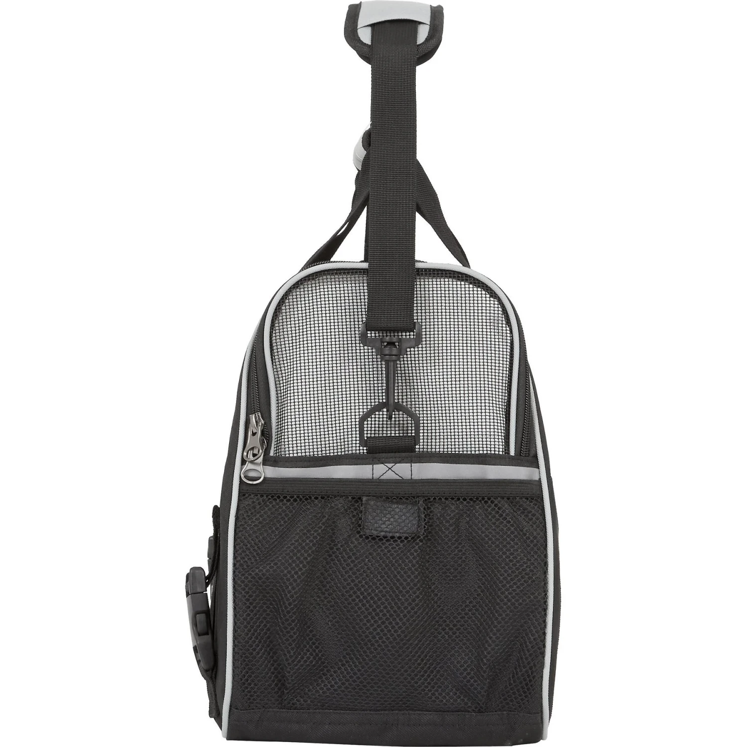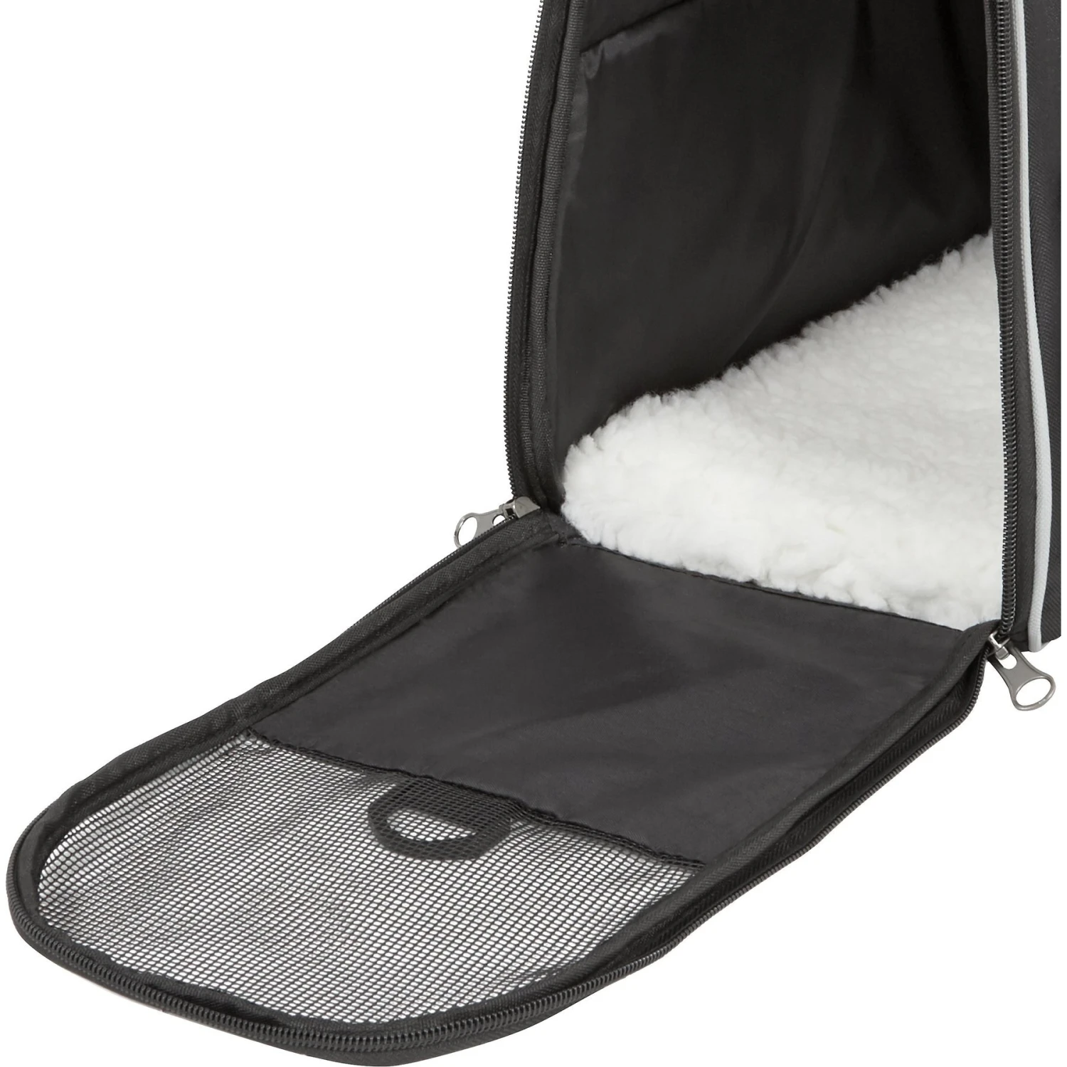 Get going—from errands to escapades—with the Frisco Everyday Pet Carrier. This carrier is designed to let you and your pal go places in style and comfort. It features a roomy interior with a floor that’s lined with soft, machine-washable sherpa for a comfy trip here, there and everywhere. This go-to carrier is also designed to comply with the under-seat compartment requirements of most airlines, since the sides can be slightly collapsed to fit. Mesh panels ensure plenty of airflow and sightseeing, and security is built in with locking zippers that can only be unzipped from the outside. It has a convenient side entry for easy in and out, shoulder straps for added mobility, and a back pocket for all your essentials. Plus, it even has a handy “petting window” for easy access to your pal. And when you get there, it folds flat for quick storage.