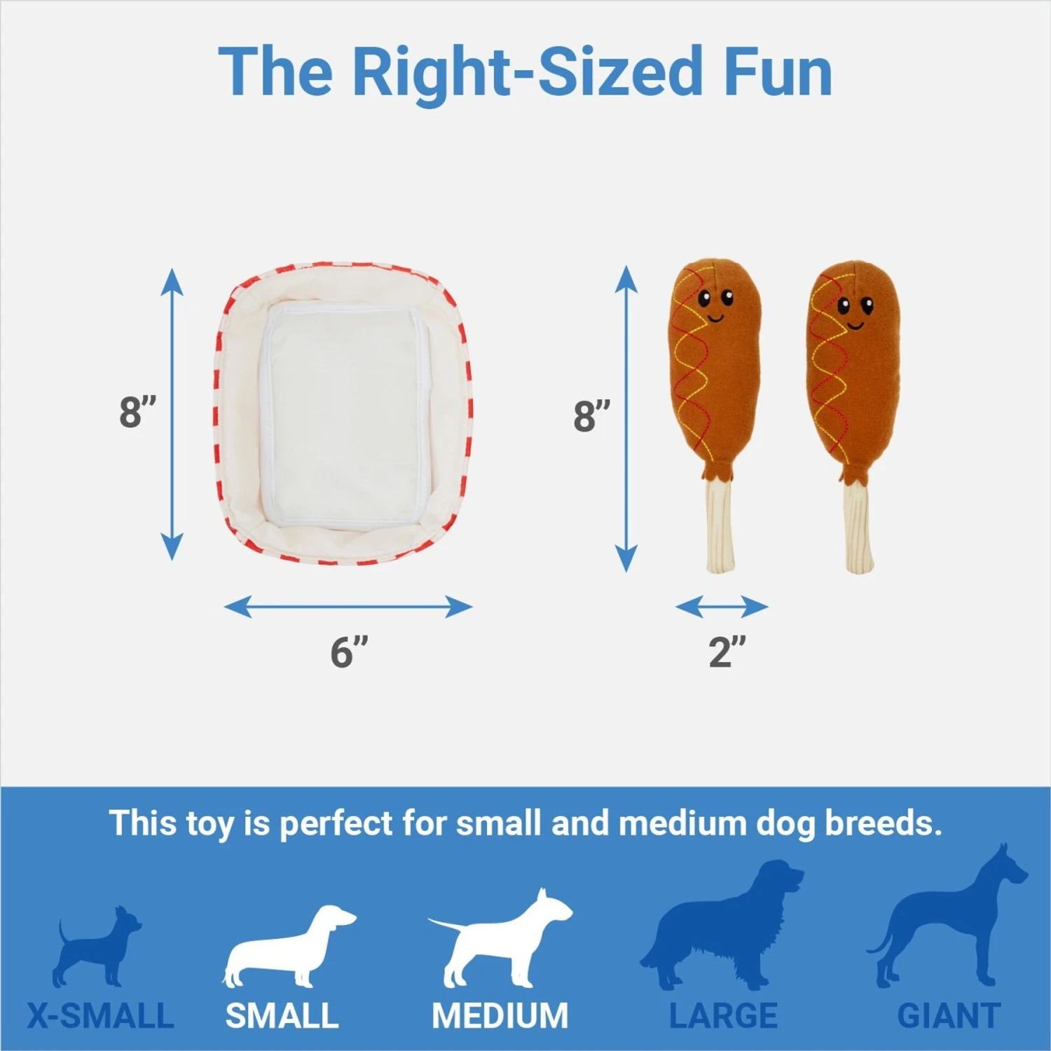 Frisco Corndog Interactive Plush Squeaky Dog Toy, Small/Medium—Send them on the field with a fun snack! This three-in-one toy will bring interactive furry fun to your pup’s baseball game. It features a plush basket and two detachable plush corn dogs that’ll engage your sporty canine at playtime. The built-in squeaker keeps this play session exciting all season long!