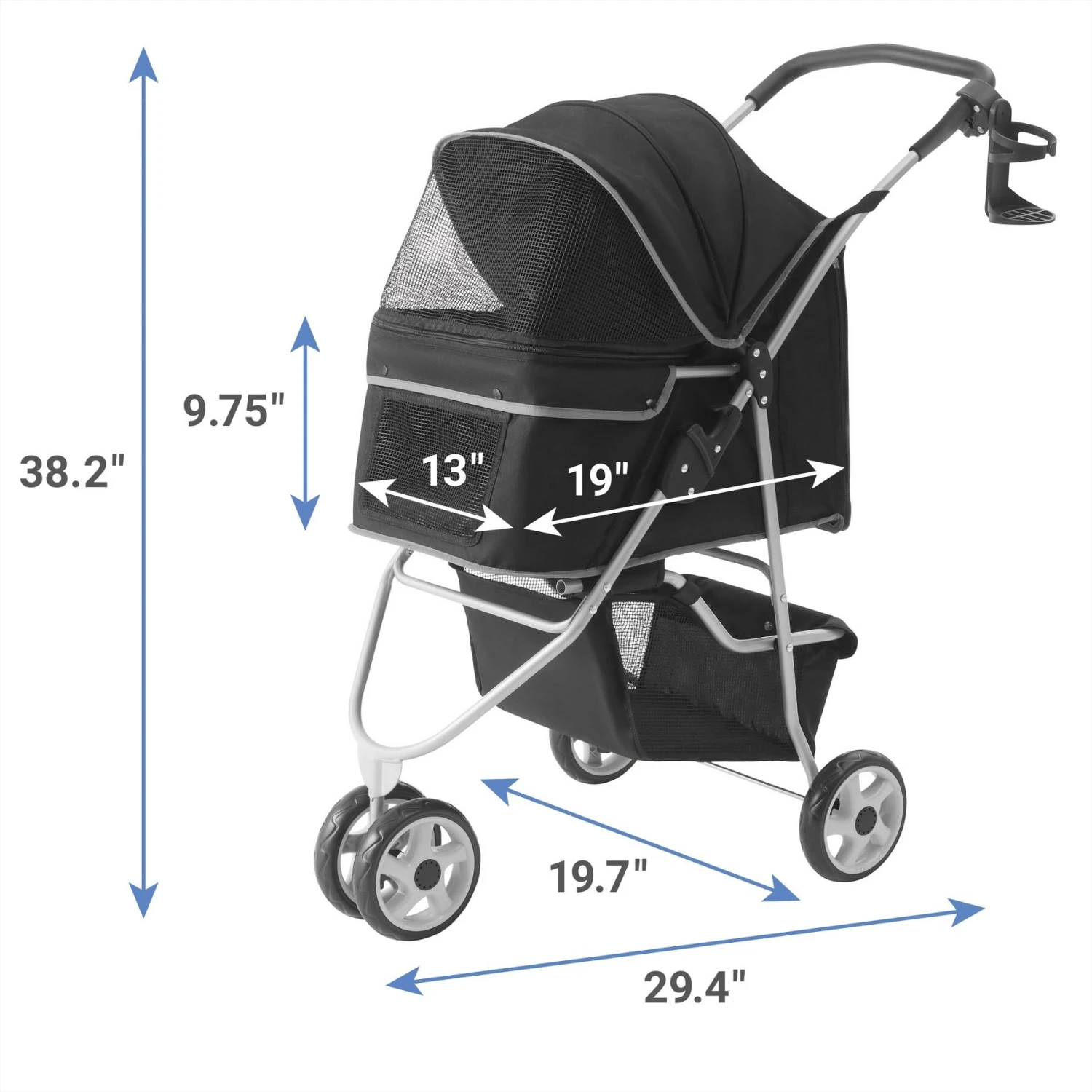 Outdoor excursions will be more comfortable and enjoyable for both you and your pet with this Frisco Dog and Cat Collapsible Stroller. The three wheels make this stroller easy to maneuver, so prepare to take your small dog or cat on a variety of adventures. A canopy and zippered mesh fabric give your pet protection from the elements (or unzip to let your pet enjoy nicer weather), and allows you to easily remove your pet when their ride ends. For long walks, use the built-in cargo basket to store their gear. When not in use, the stroller collapses for easy storage and transportation. Bring your small dog or cat along for an adventure with this handy stroller, from the pet experts at Frisco, by Chewy.