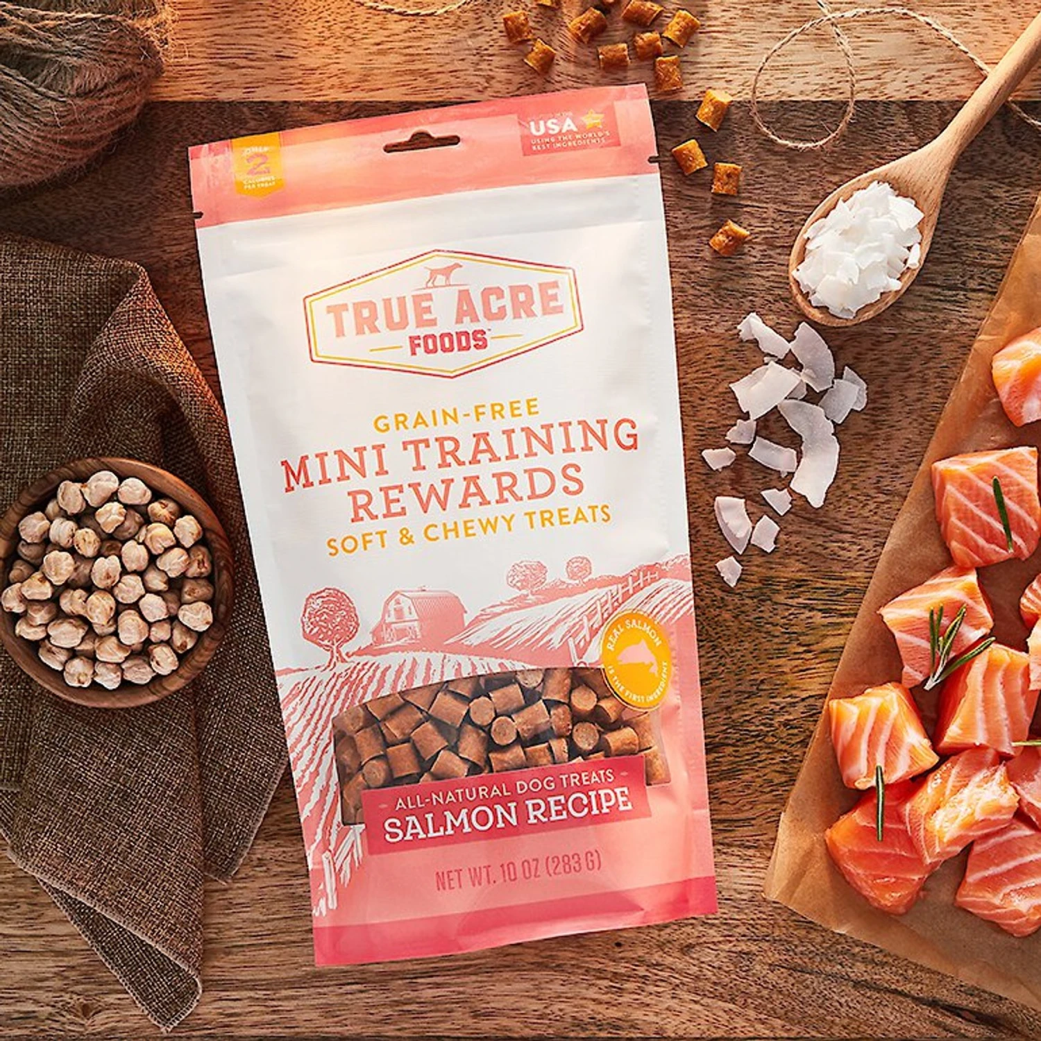 Frisco Fetch Squeaking Colorful Tennis Ball Dog Toy & True Acre Foods Salmon Recipe Mini-Training Rewards Grain-Free Soft & Chewy Dog Treats