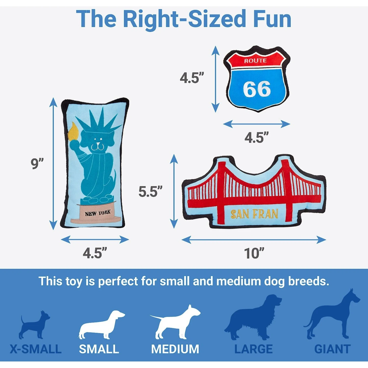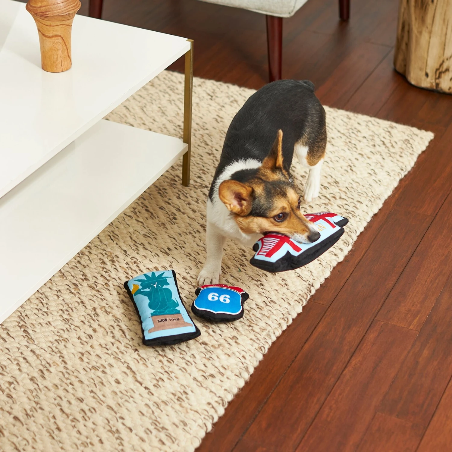 It’s not a road trip without fun souvenirs! This three-count Frisco Road Trip Sightseeing Plush Squeaky Dog Toy features Route 66 and Golden Gate Bridge designs, plus a “Statue of Pupperty”. These stuffing-free plushies even have built-in squeakers and crinkle paper so your pup can add the sweet sounds of fun to your road trip playlist.